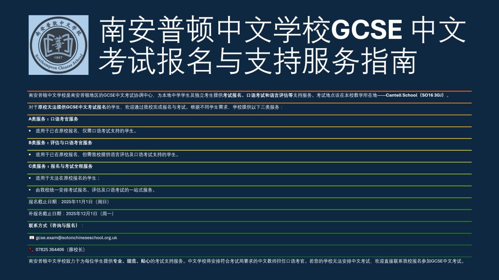 Southampton Chinese School is committed to providing every student with professional, reliable, and comprehensive exam support. All oral exams will be conducted by qualified Chinese teachers approved by the exam board. If your school cannot arrange the GCSE Chinese exam, please contact us directly to register through our centre.