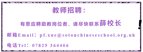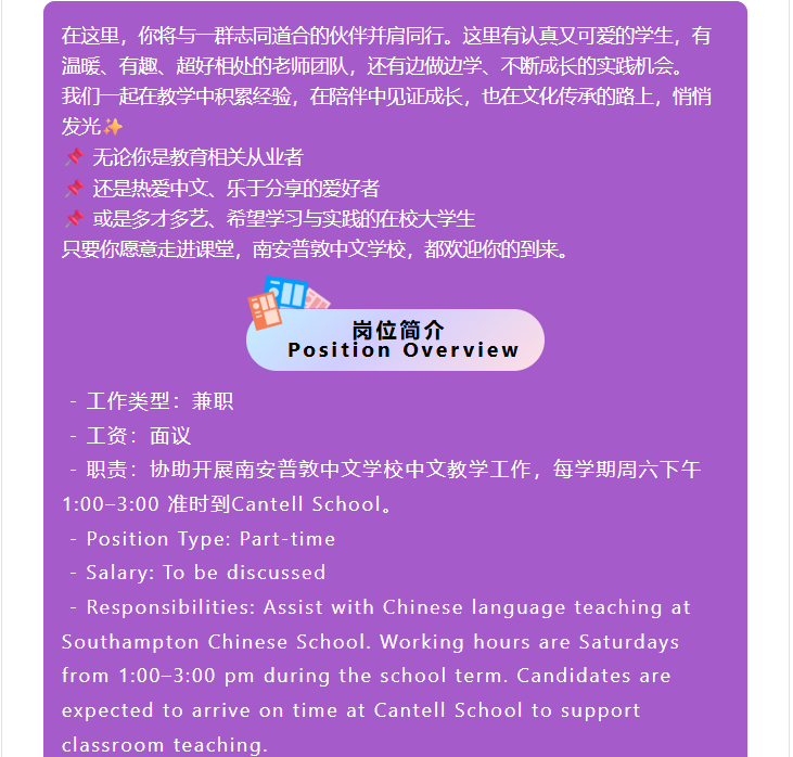 南安普敦中文学校现诚聘教学助理数名